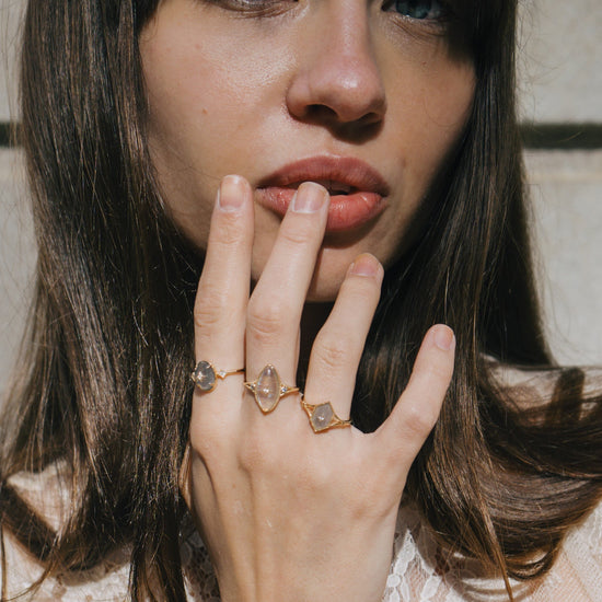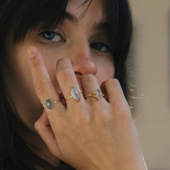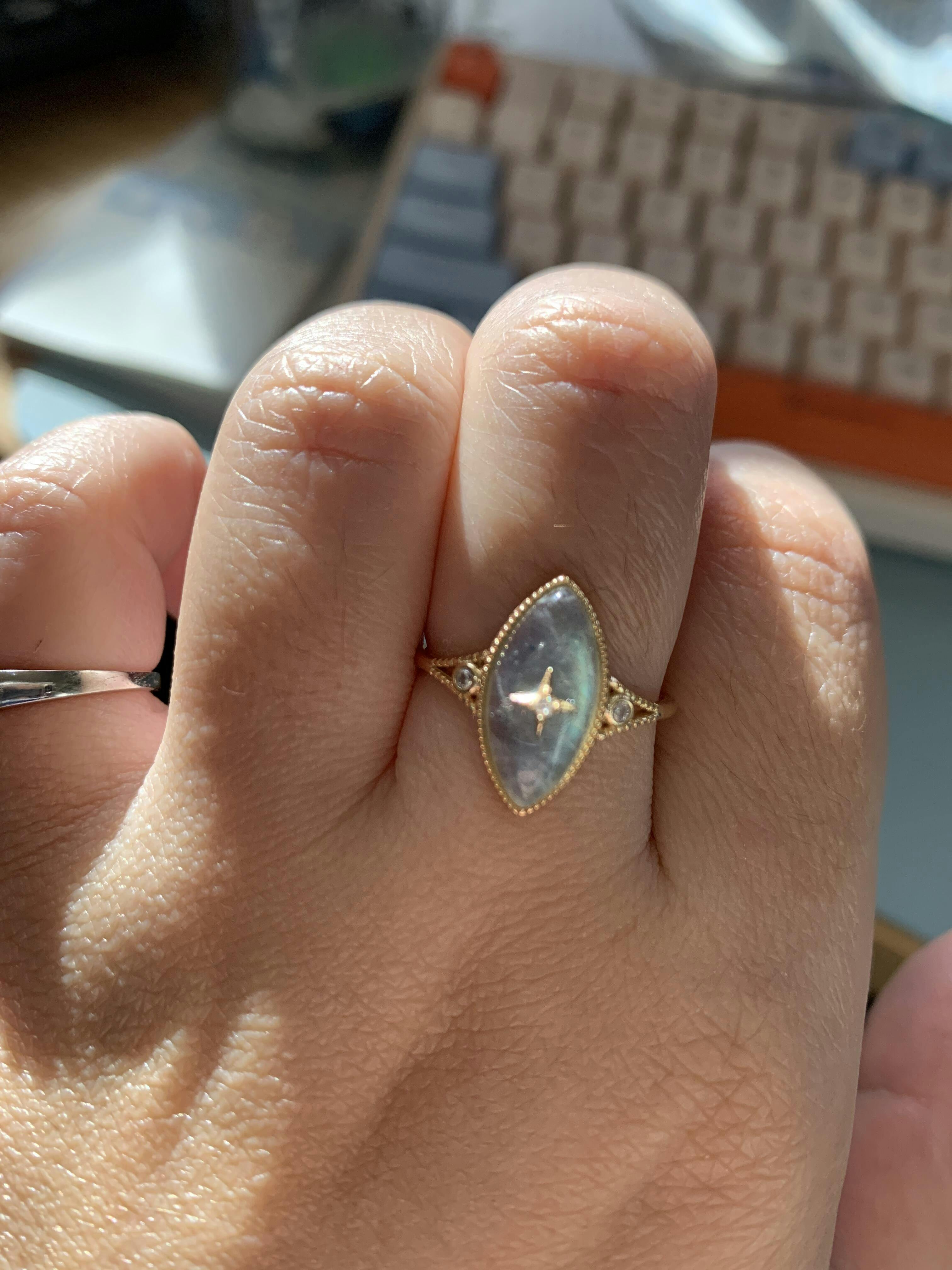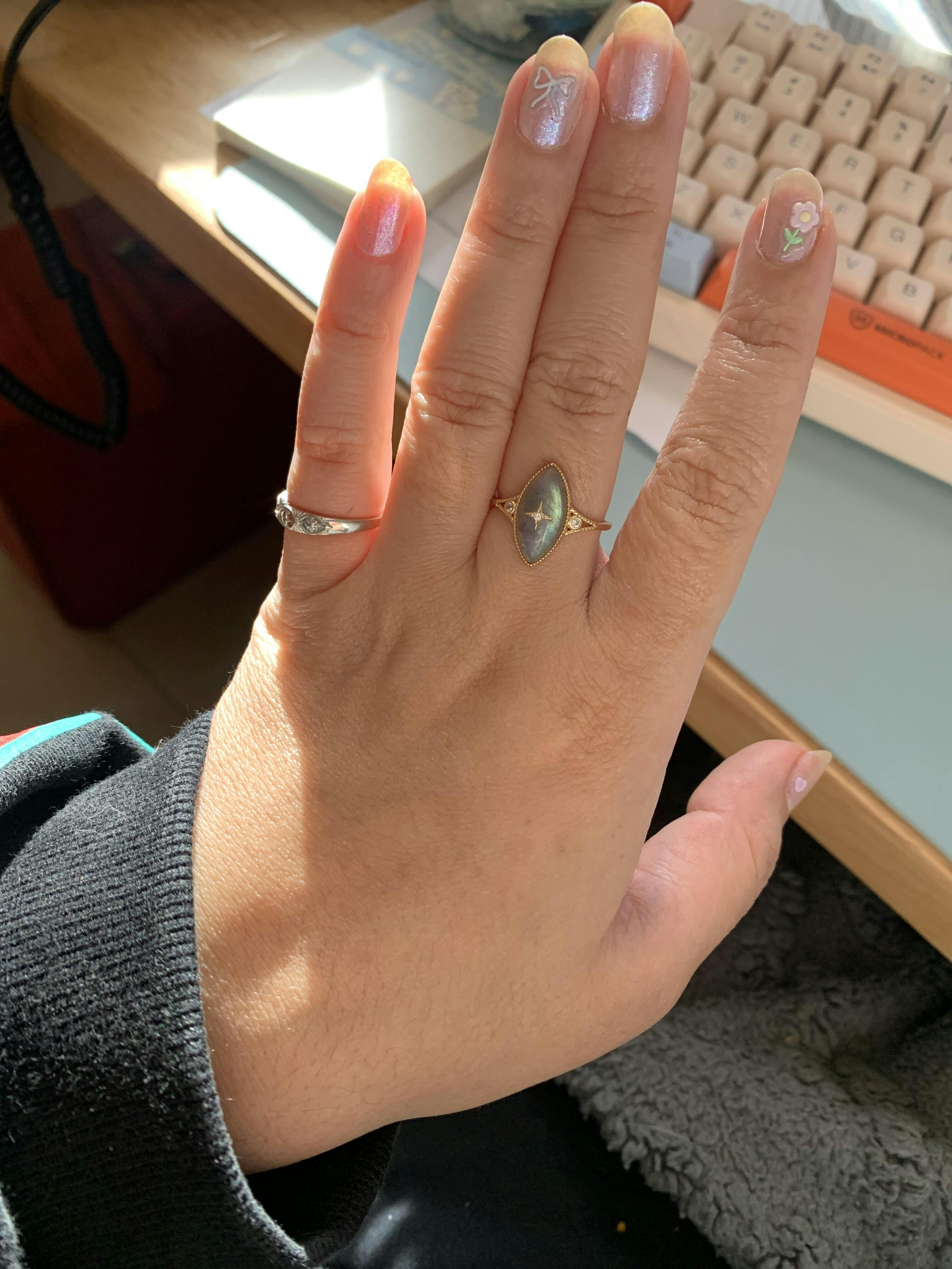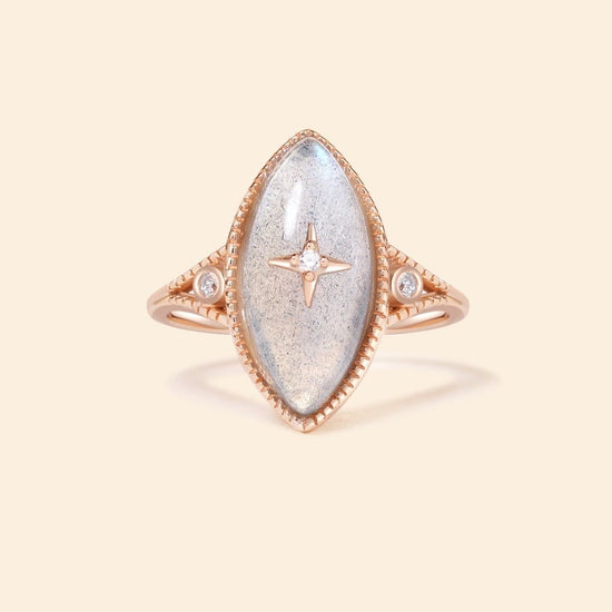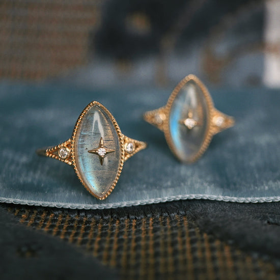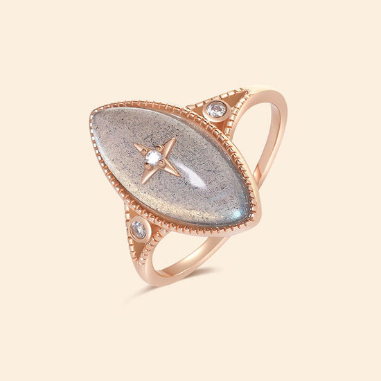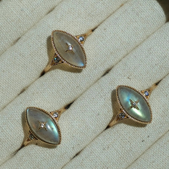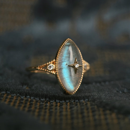 A glimmer of starlight captured in stone—this handcrafted ring features a marquise-cut labradorite with a celestial glow. A tiny star sits at the center, flanked by two shimmering accent stones, evoking the mystery and serenity of a night sky.