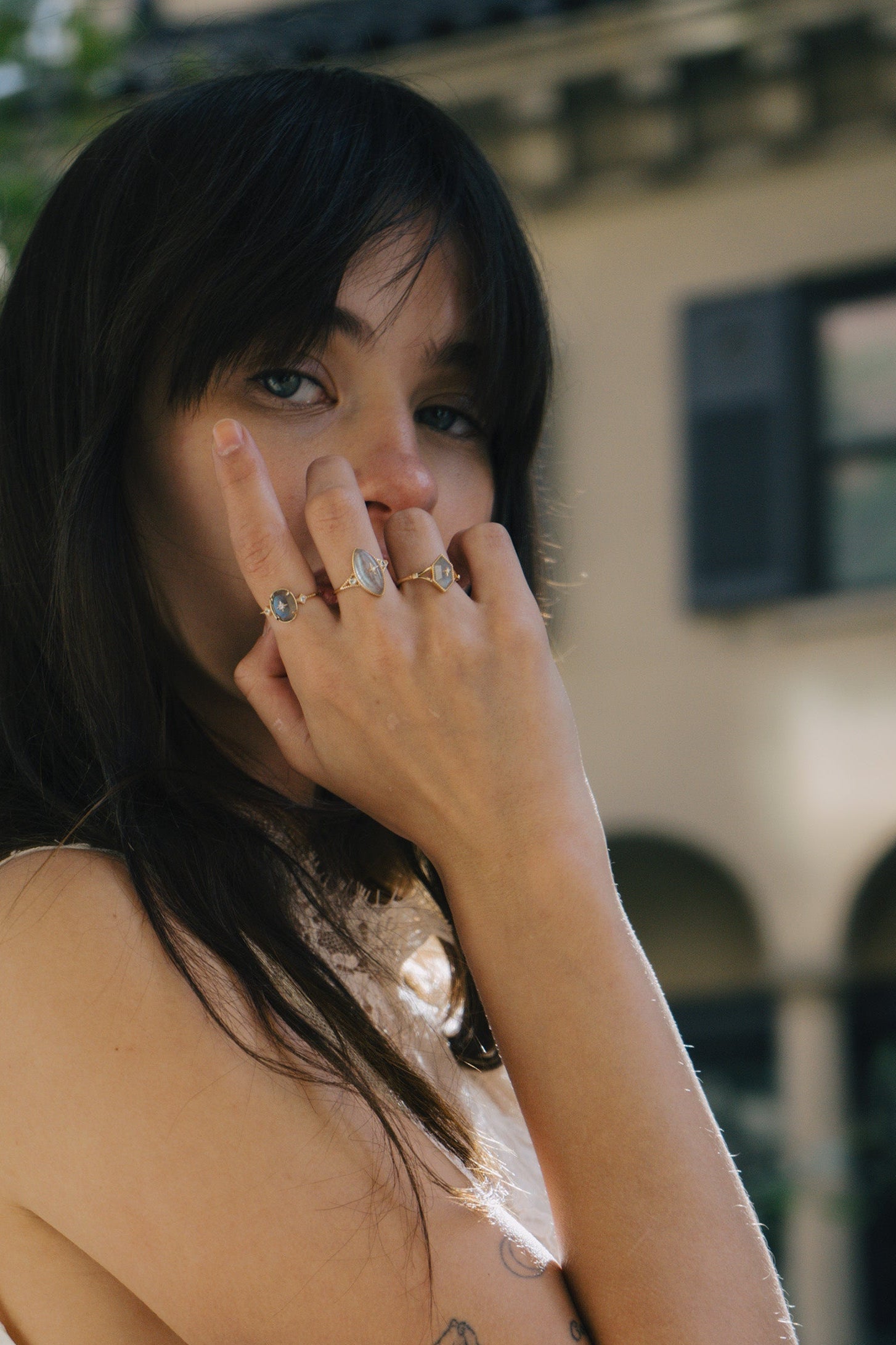 A glimmer of starlight captured in stone—this handcrafted ring features a marquise-cut labradorite with a celestial glow, set in 14K gold vermeil. A tiny star sits at the center, flanked by two shimmering accent stones, evoking the mystery and serenity of a night sky.