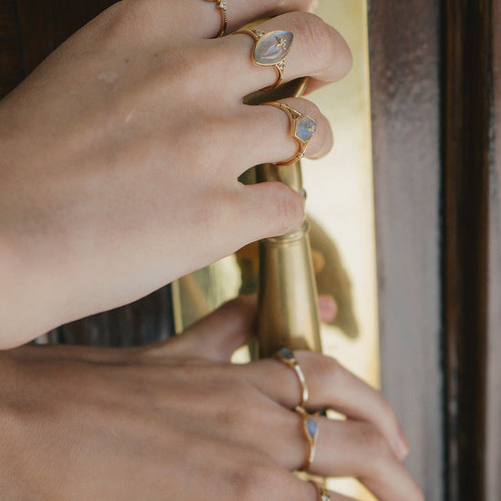 The shape echoes an eye gazing into the cosmos, or a comet streaking across the dark. Whether worn alone or stacked, this piece serves as a gentle reminder: you carry the universe within.