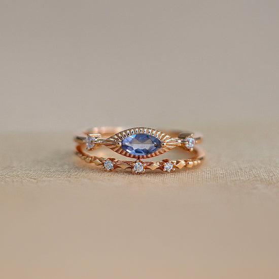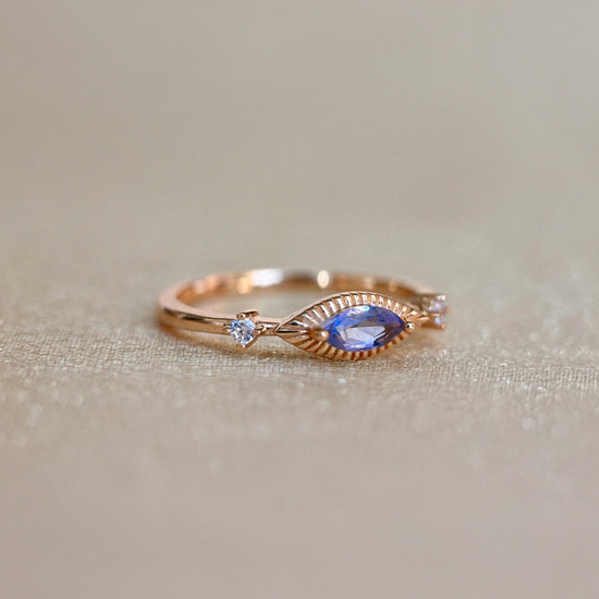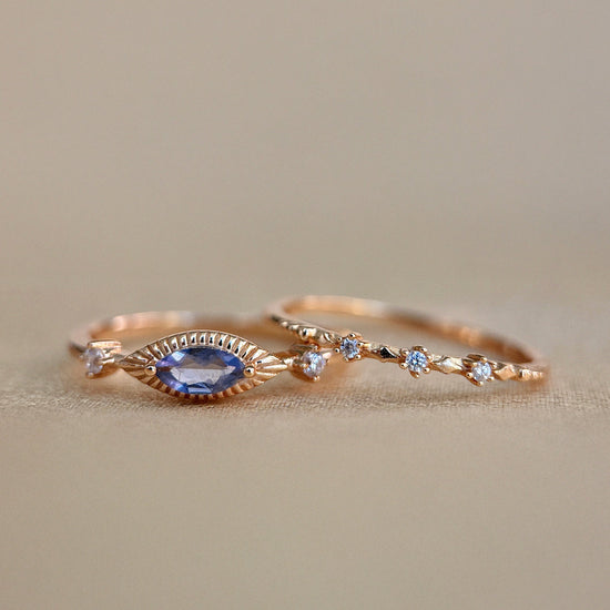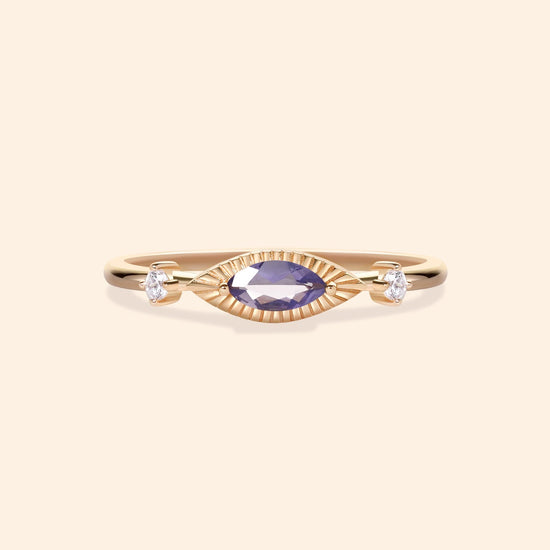 A poetic union of mystery and refinement, this Devil's Eye Ring features a shimmering marquise-cut natural Iolite stone, haloed by delicately milgrained gold, evoking the shape of a protective eye.