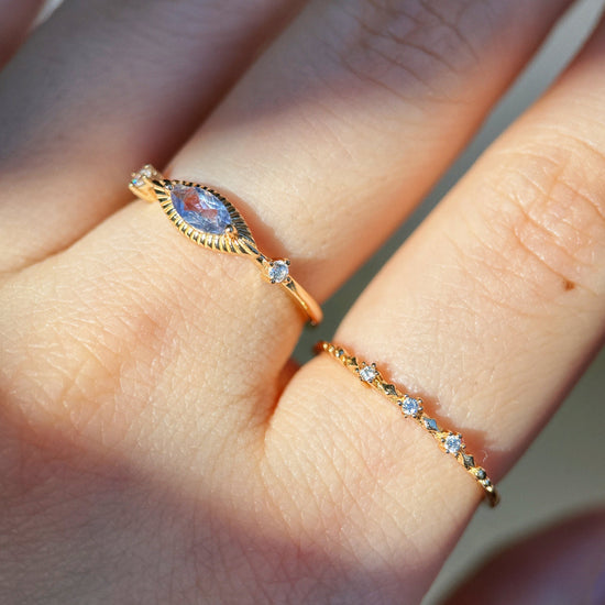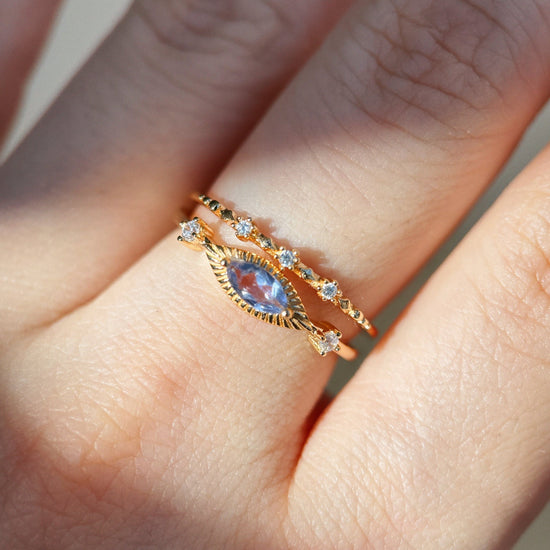 Set on a slender gold band, this piece balances symmetry with a whisper of the mystical — like a vision seen in a dream, or a starlit omen. Whether worn alone or layered, it brings a touch of old-world magic to your every gesture.