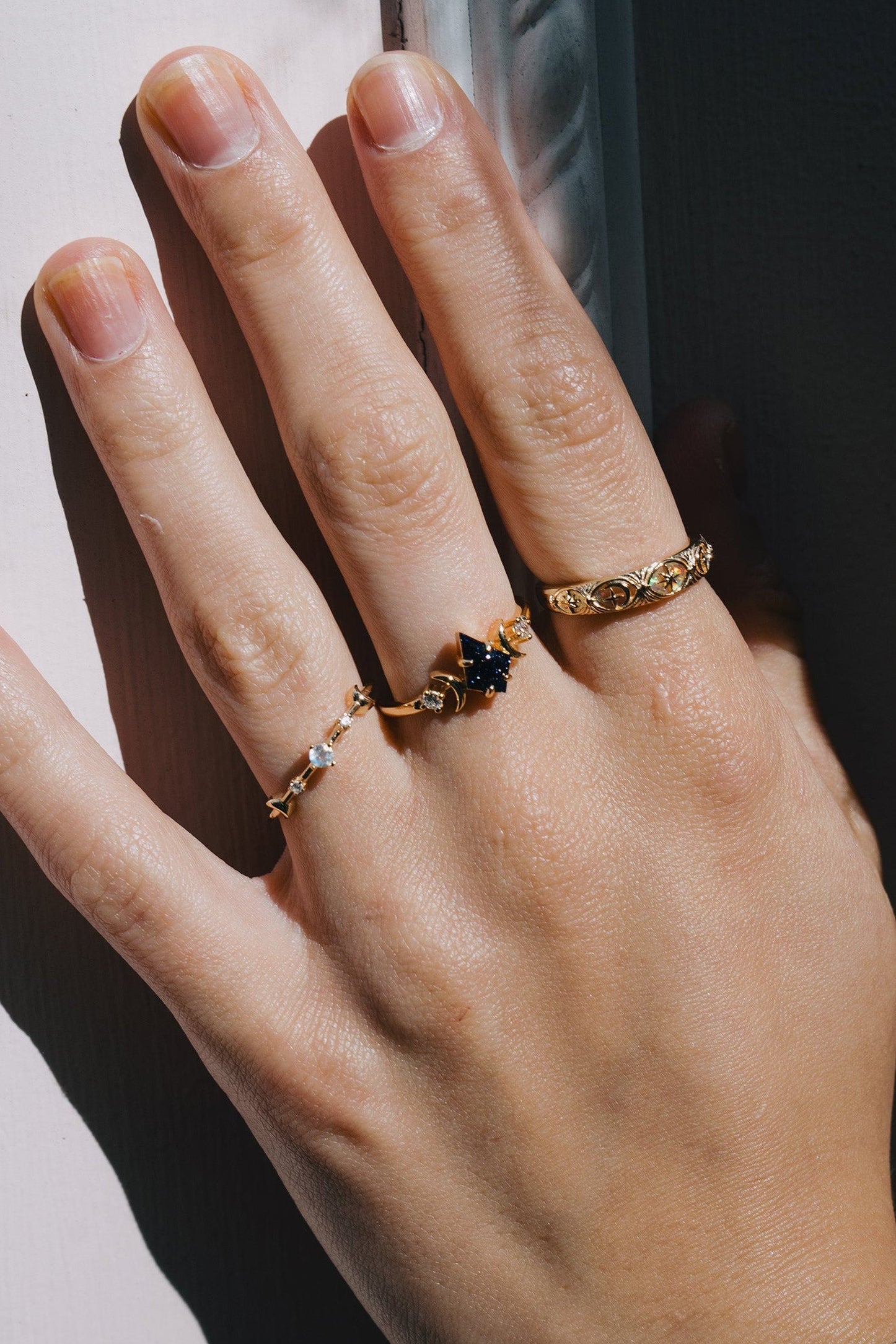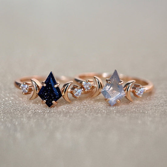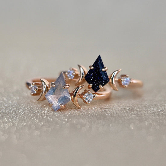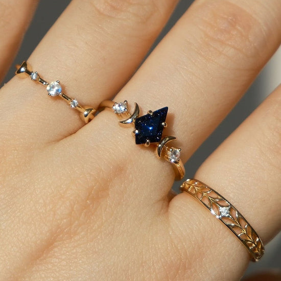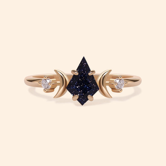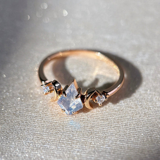A luminous star captured in gold — Estella features a kite cut center stone embraced by crescent moons and tiny diamonds. Inspired by celestial elegance, this ring evokes vintage romance and cosmic wonder in a delicate, artful form.