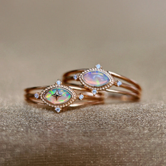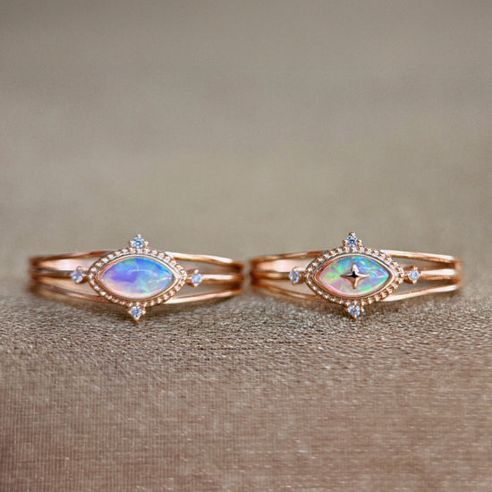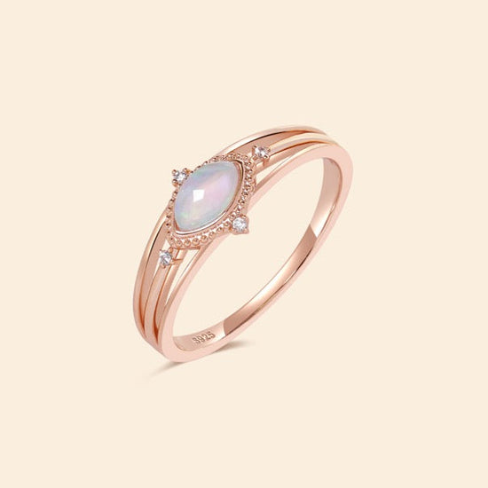 A dreamy ring featuring a luminous marquise-cut fire opal, accented with delicate high quality moissanite at the cardinal points. A perfect stacking piece or a unique stand-alone ring.