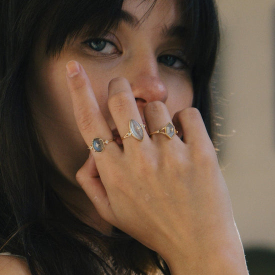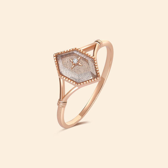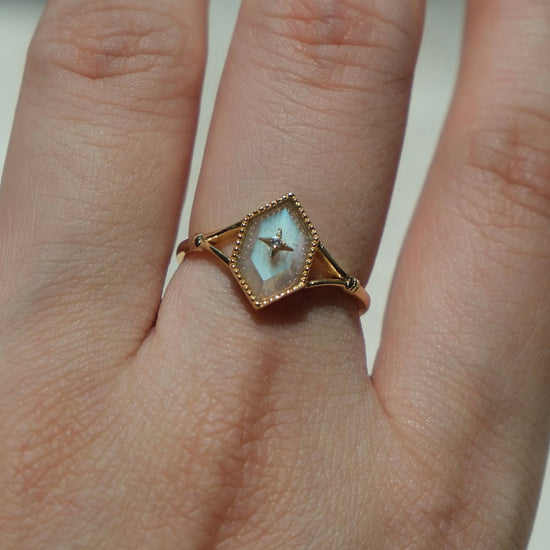 This one-of-a-kind ring features a rhombus-cut labradorite, glowing with soft inner light and set beneath a tiny gold star. Thoughtfully designed for dreamers, stargazers, and those who love statement pieces with soul.