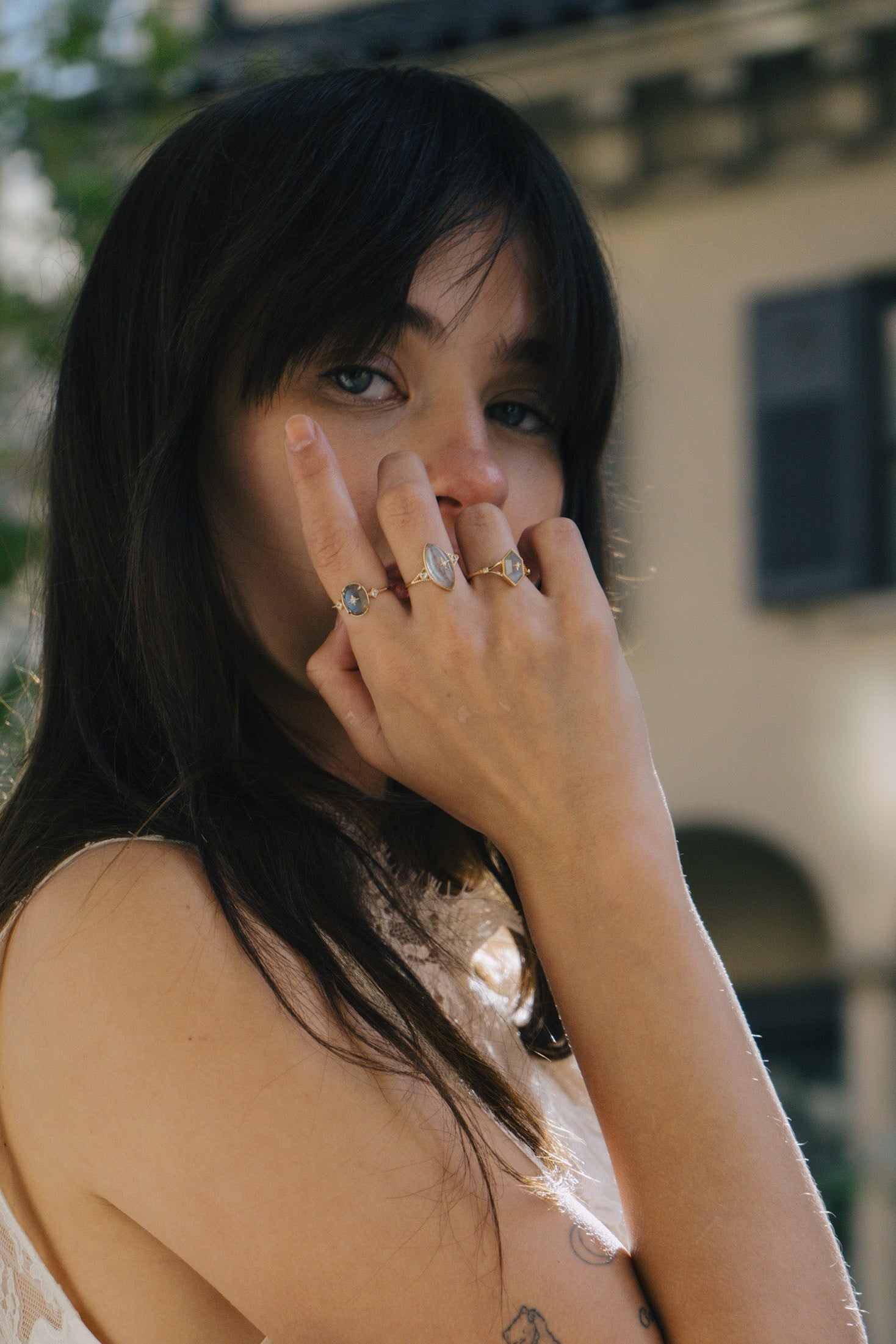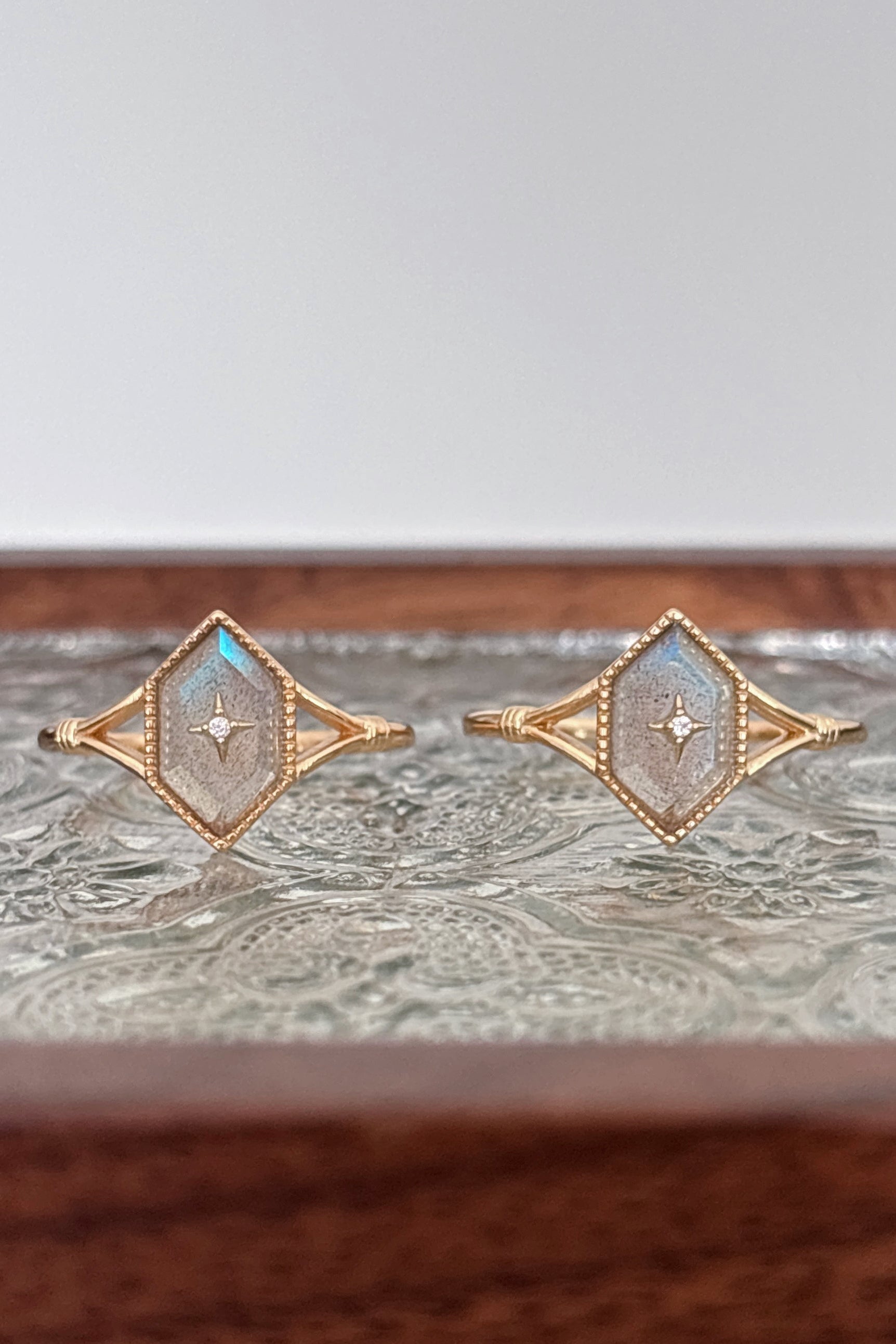 This one-of-a-kind ring features a rhombus-cut labradorite, glowing with soft inner light and set beneath a tiny gold star. Framed in a delicate gold vermeil setting, it blends celestial motifs with clean geometric lines.