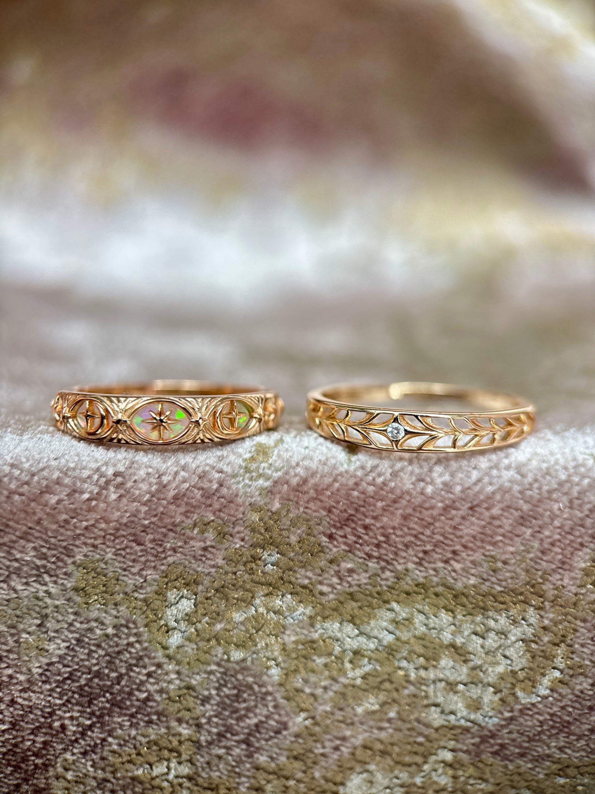 A delicate band inspired by the cosmos, featuring a star-set diamond framed by an openwork pattern reminiscent of constellations or rays of light. Crafted in 14K gold vermeil, this celestial ring is perfect for stacking or wearing solo as a quiet tribute to the stars.