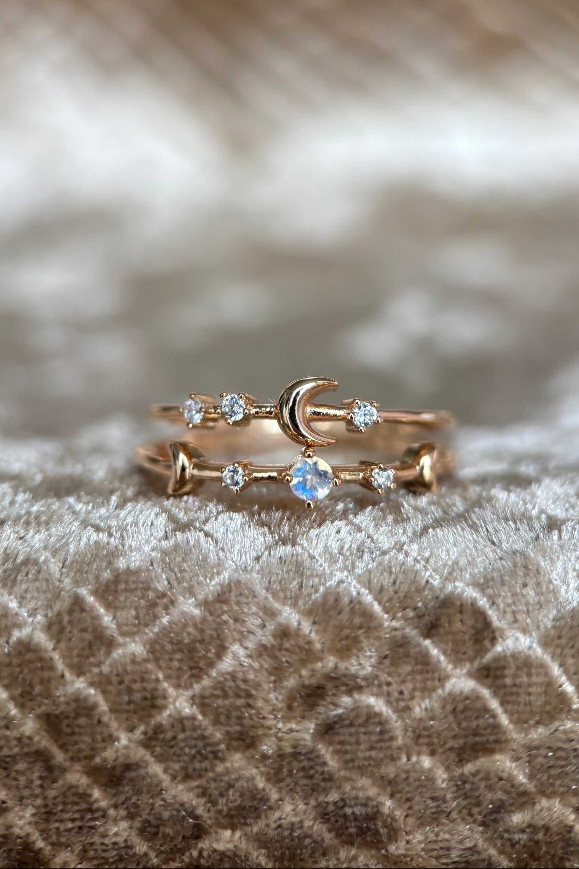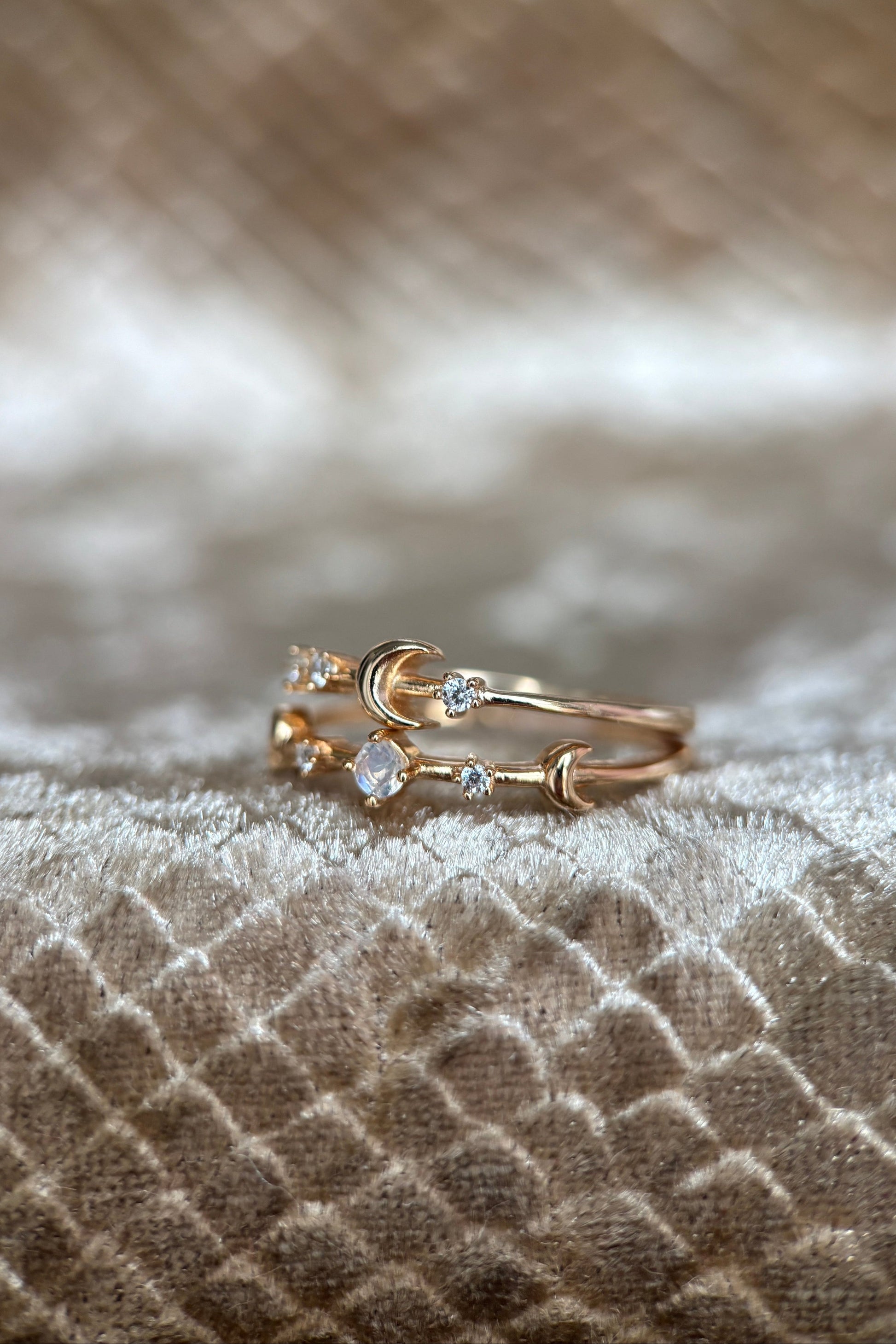 A luminous moonstone cradled between two crescent moons, kissed by twinkling stars. This ring captures the quiet poetry of the night sky — where moonlight meets starlight, and dreams shimmer softly.