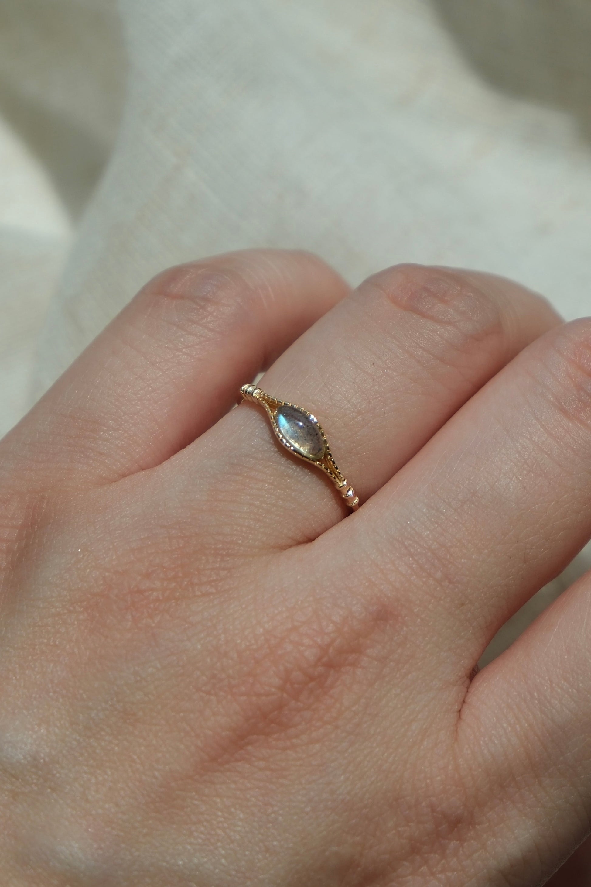 A celestial-inspired ring featuring a marquise-cut labradorite, glowing with iridescent blue flashes. Set in a 14K gold vermeil band, this dainty ring is perfect for everyday elegance or stacking with your favorite bands. The finely textured bezel and cosmic shape evoke moonlight and quiet mystery.